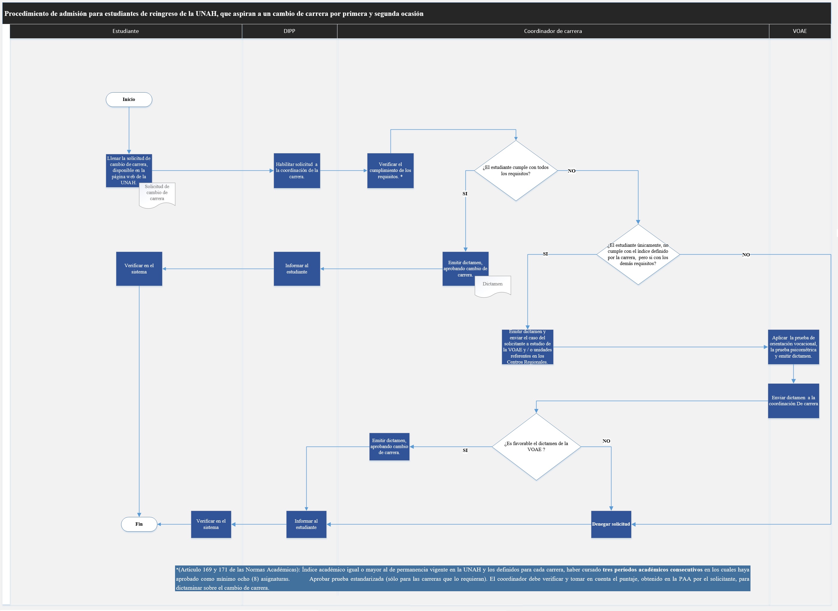 Artículo 169. Para realizar cambio de carrera, el estudiante debe tener el índice académico de permanencia vigente en la UNAH o los definidos para cada carrera, el que siempre será mayor a éste. Si el estudiante no cumple con el índice definido por la carrera, deberá ser sometido a estudios y dictamen respectivo de la VOAE y /o unidades referentes en los centros regionales universitarios.