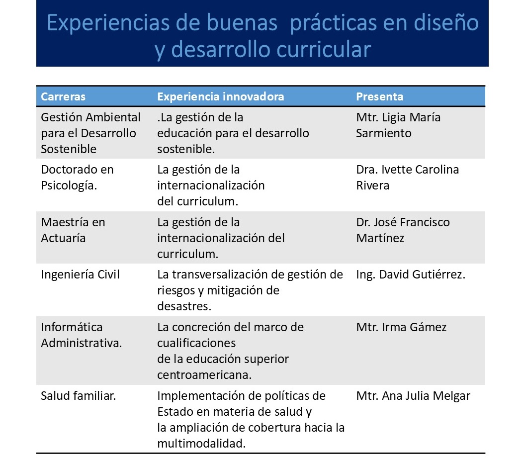Se compartirán buenas prácticas desarrolladas en la UNAH, como la transversalización de los Objetivos de Desarrollo Sostenible en el currículum, la aplicación del Marco de Cualificaciones de la Educación Superior Centroamericana, la transversalización de la Gestión del Riesgos, la aplicación de la multimodalidad educativa y la internacionalización del currículum.